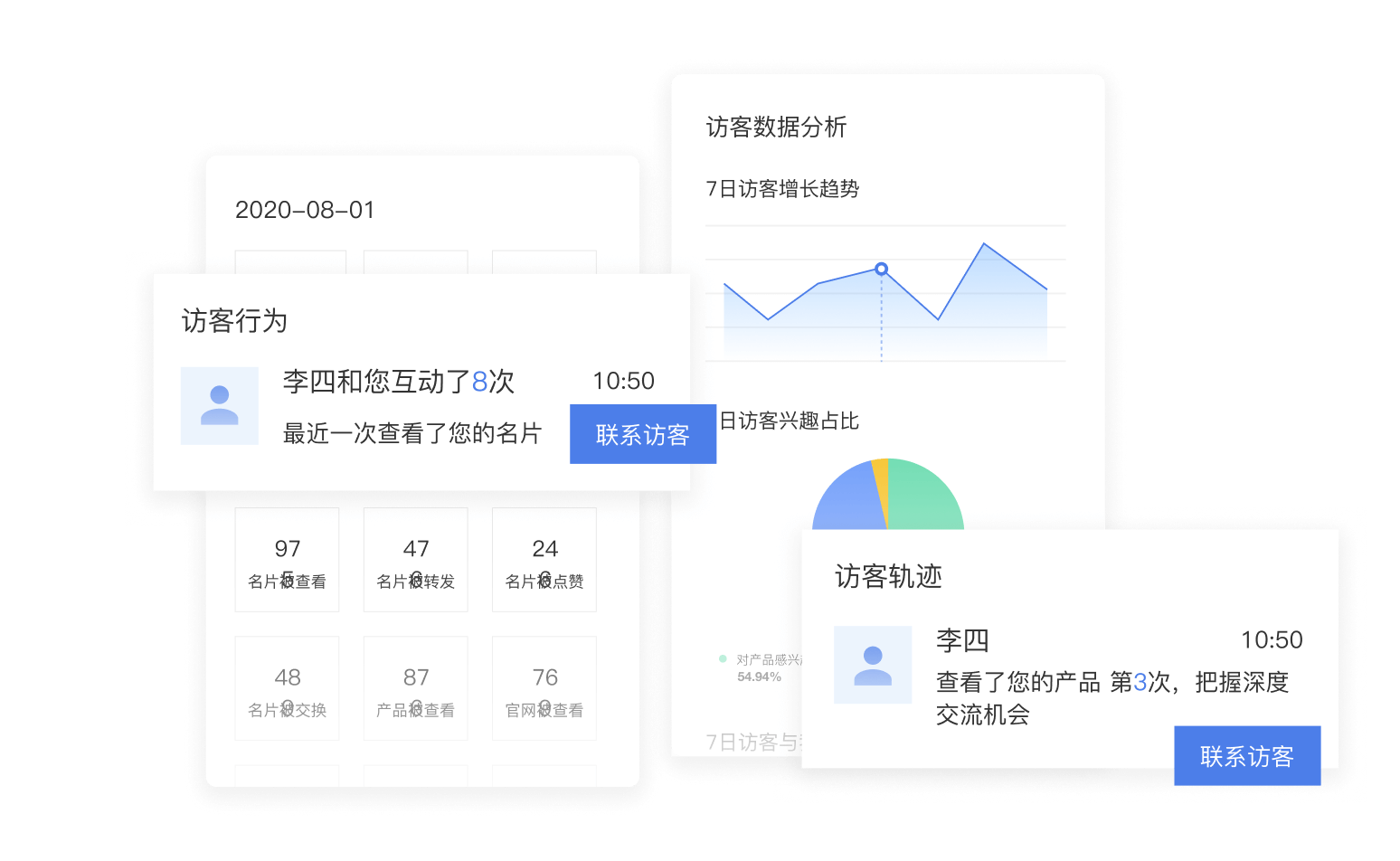 赢在名片拥有访客浏览历史、行为轨迹跟踪、访客增长互动等数据分析,助您分析用户感兴趣的产品,多维度筛选潜在客户