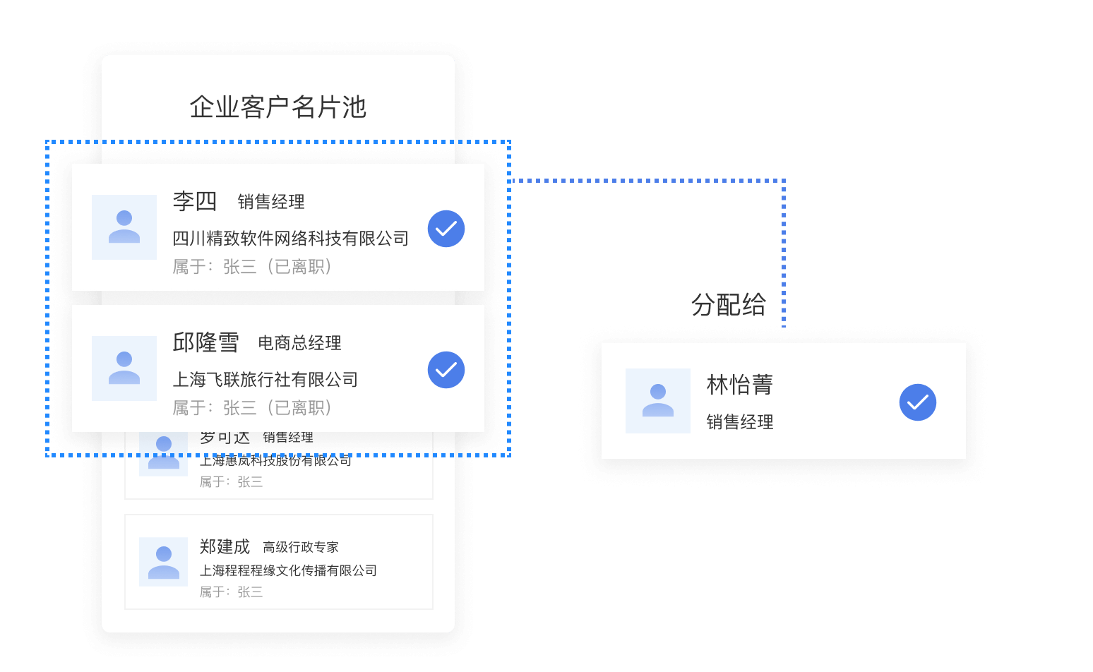 所有客户全部留存至客户名片池,员工离职可一键进行客户交接,最大限度降低客户流失,保证客户沉淀为企业资源